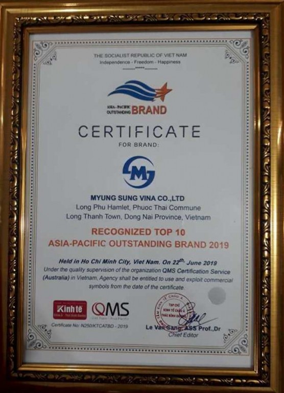 Công Ty TNHH Myung Sung Vina đạt danh hiệu "Top 10 thương hiệu tiêu biểu hội nhập châu Á – Thái Bình Dương 2019”